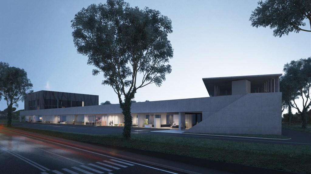 I volumi che compongono l’edificio sono principalmente due e sono immediatamente identificabili: il primo, alto e monumentale, contiene la parte creativa di SLAMP, la ‘fabbrica della luce’, il secondo, stretto e lungo, la zona commerciale di condivisione con altre aziende.