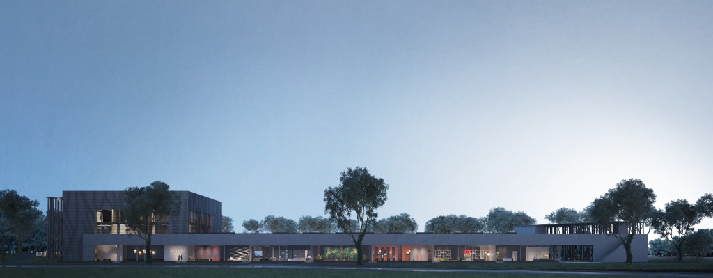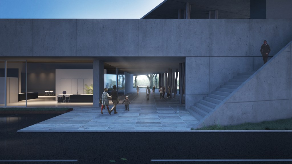 L’apertura agli apporti creativi esterni e la muntifunzionalità vengono espressi attraverso un elemento forte, un ‘nastro’ in cemento, anch’esso sospeso, che, come un abbraccio, avvolge il corpo di fabbrica più basso. L’unità viene data dalla selva di pilastri di altezza monumentale che si trovano alle due teste dell’edificio, a raffigurare il dialogo e l’equilibrio tra le parti funzionali e non la loro subordinazione gerarchica. Lo stesso pannello in cemento delimita la grande piazza ludico-ricreativa che trova spazio sul tetto, e si intreccia tra i pilastri sostenendoli.
