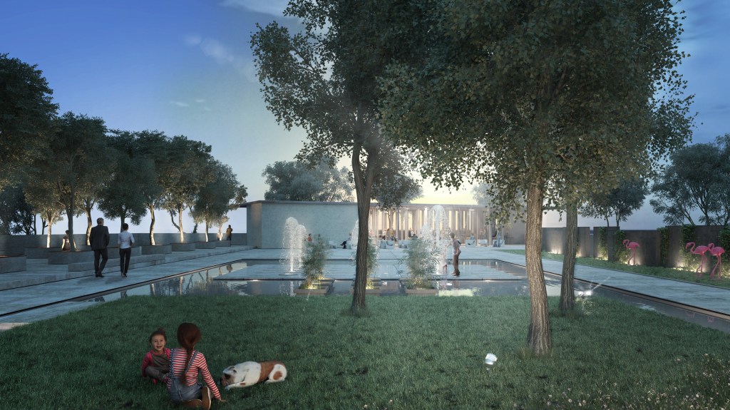 La “piazza” ragruppa in se tre elementi naturali: terra, acqua e luce. Un luogo unico, che si raggiunge attraverso una scalinata esterna, oppure dal piano della creazione di SLAMP, e che si trova sulla copertura del corpo di fabbrica commerciale: qui un grande specchio d’acqua gioca con il verde un ruolo importante nella definizione dello spazio dedicato agli eventi, o al relax e allo svago. Attorno all’acqua la vegetazione si arricchisce di alberi che, con la loro ombra, aiutano a raffrescare in estate. Dal punto di ristoro si potrà anche godere della vista sul parco e avere la possibilità, sorseggiando un buon bicchiere di vino, di ammirare il tramonto guardando all’orizzonte il mare.