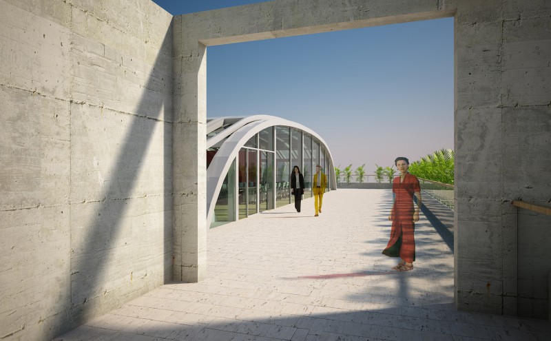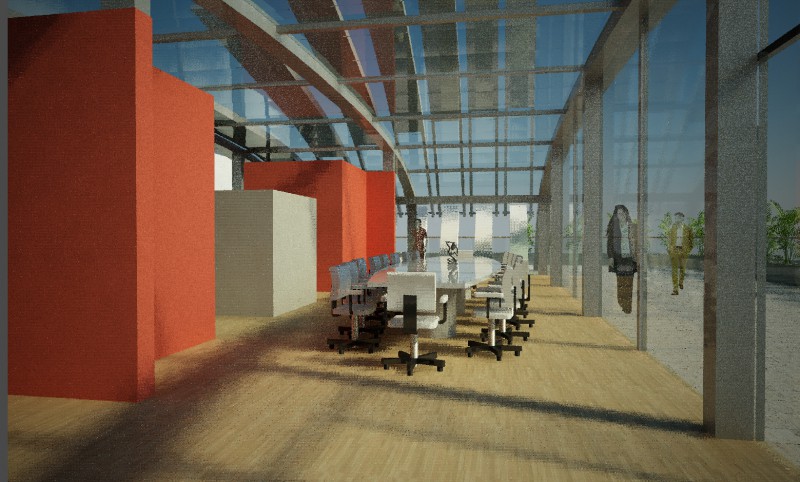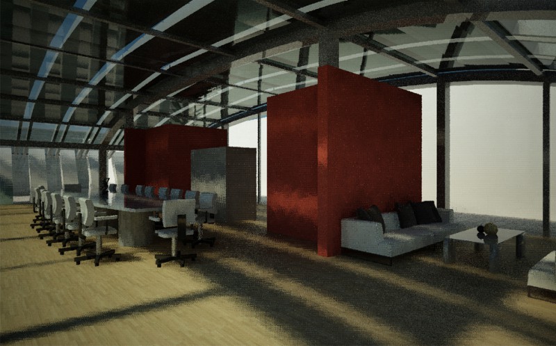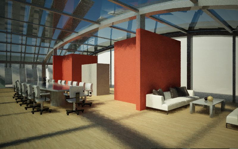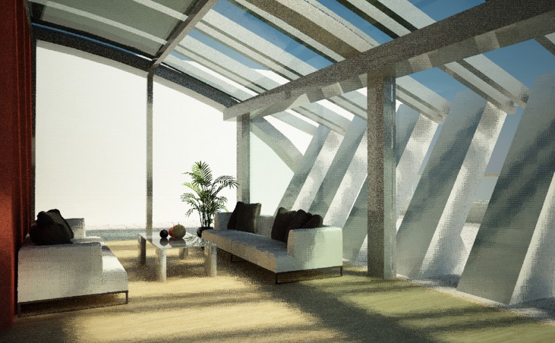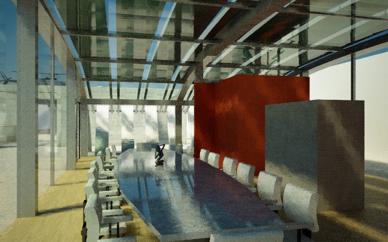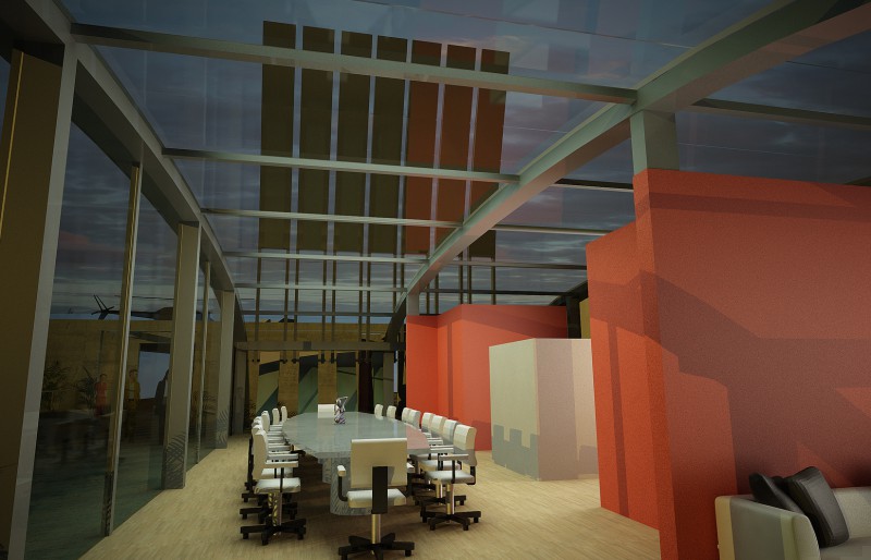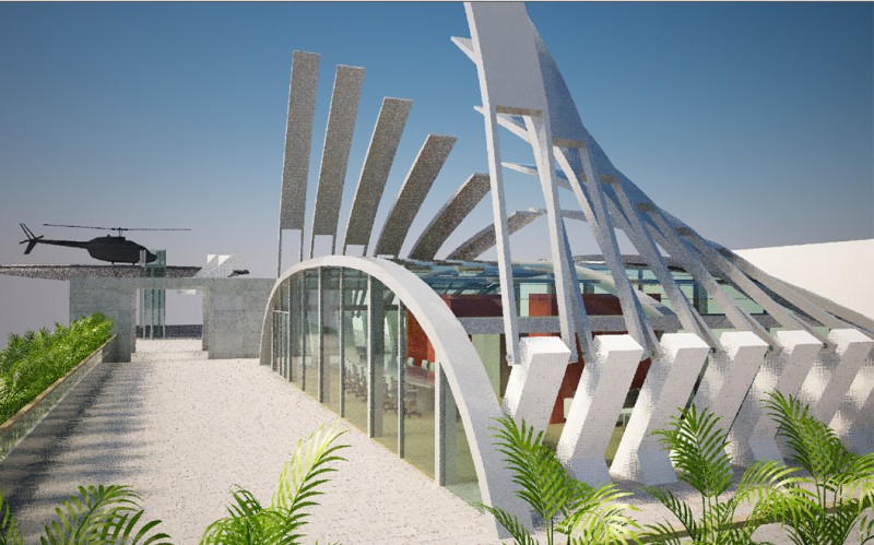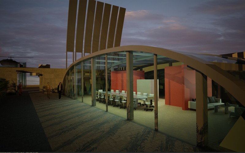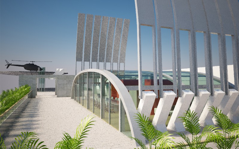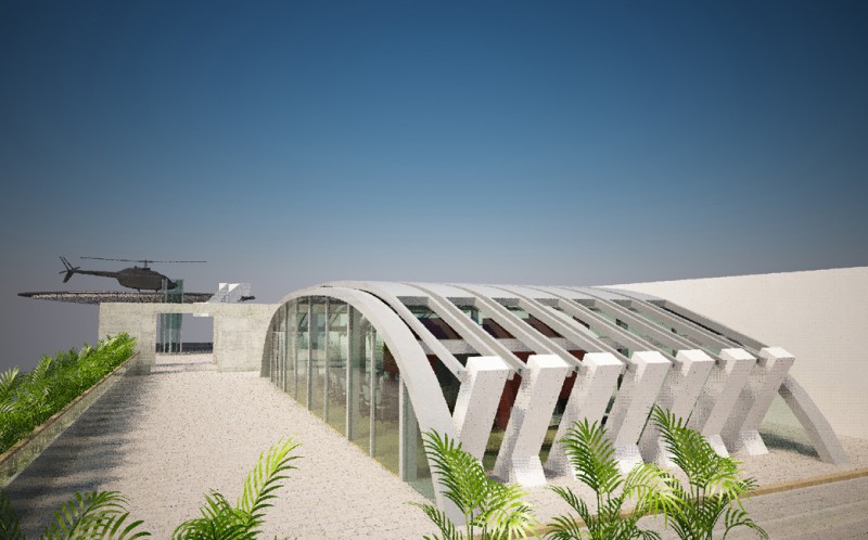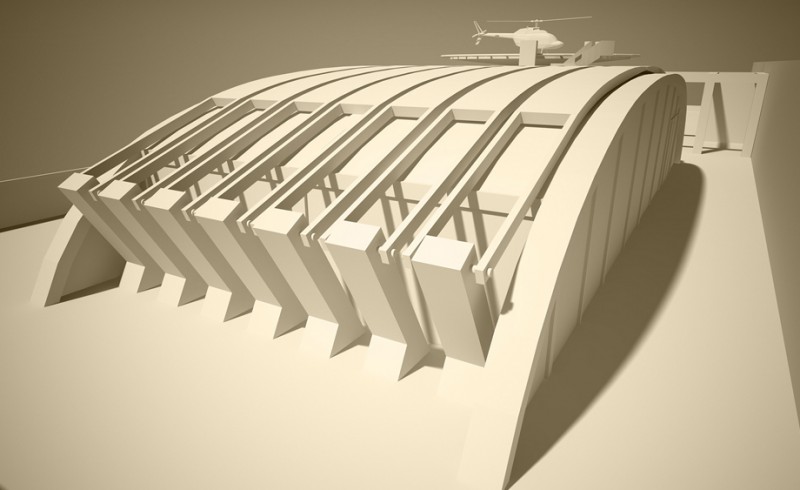 La sede di Arzanànavi a Marghera è un edificio di oltre venti metri di altezza che dà sulla Laguna di Venezia. Sul tetto si deve realizzare un eliporto ed una sala riunioni esclusiva per meeting ed eventi. Il progetto parte dai vincoli imposti dall’edificio già progettato, e dal luogo: il mare e la volta del cielo. La linea caratteristica degli yacht Arzanà viene ripresa nella forma curva della costruzione totalmente in vetro. L’oggetto gode appieno dei mutamenti del cielo: tramonto, volta stellata, pieno sole e riflessi sfaccettati dell’acqua. Grandi pale in vetroresina si aprono e si chiuduno come giganteschi remi a seconda delle necessità di luce. Una zona filtro in cemento armato grezzo permette la connessione con la scala e l’escensore interni e misura lo spazio del tetto. La terrazza scoperta rimane come luogo di incontro per eventi particolari. Dall’eliporto si sbarca direttamente in questa zona di accoglienza. I materiali sono pensati per poter essere realizzati anche dalla committenza.
